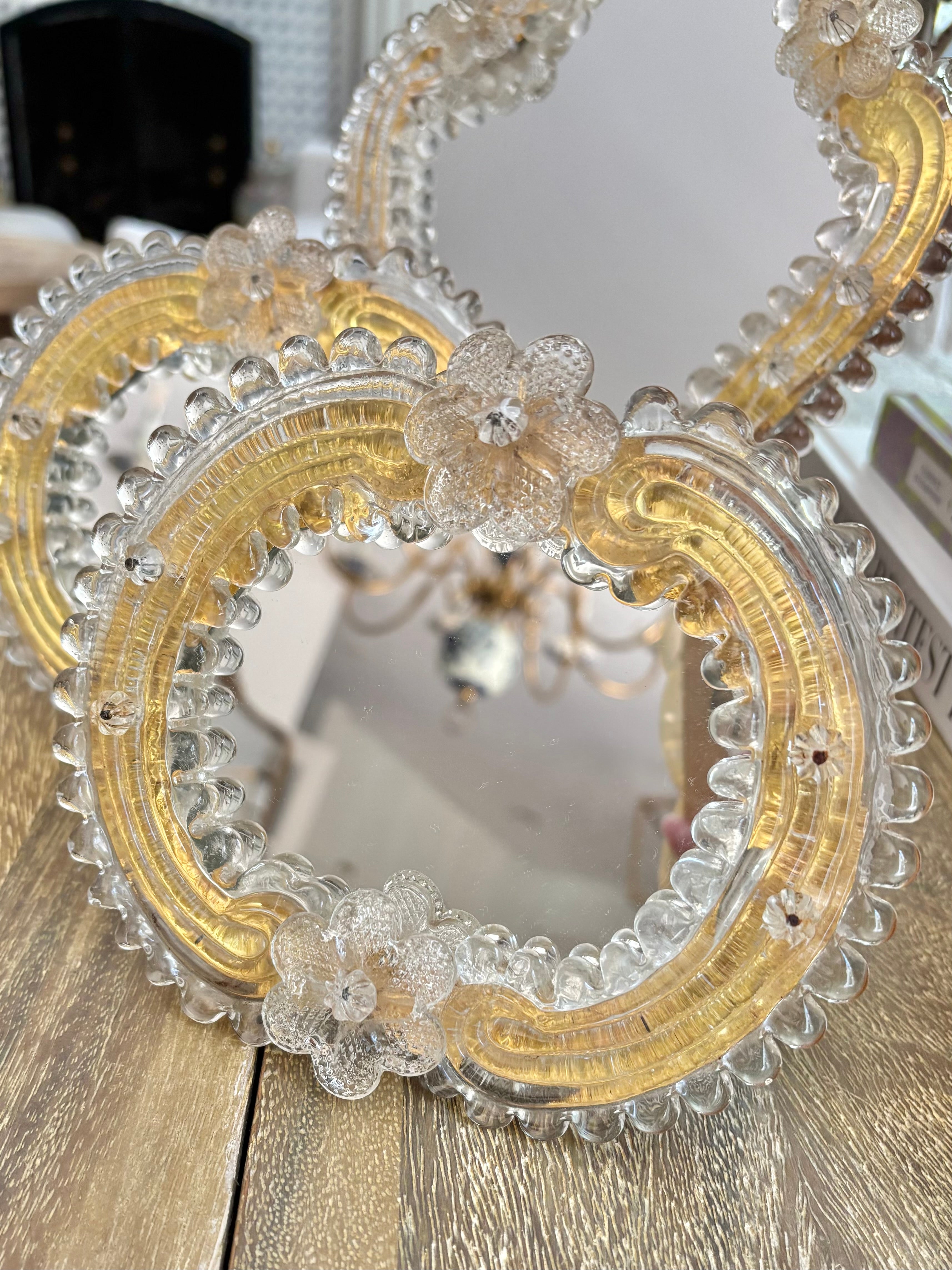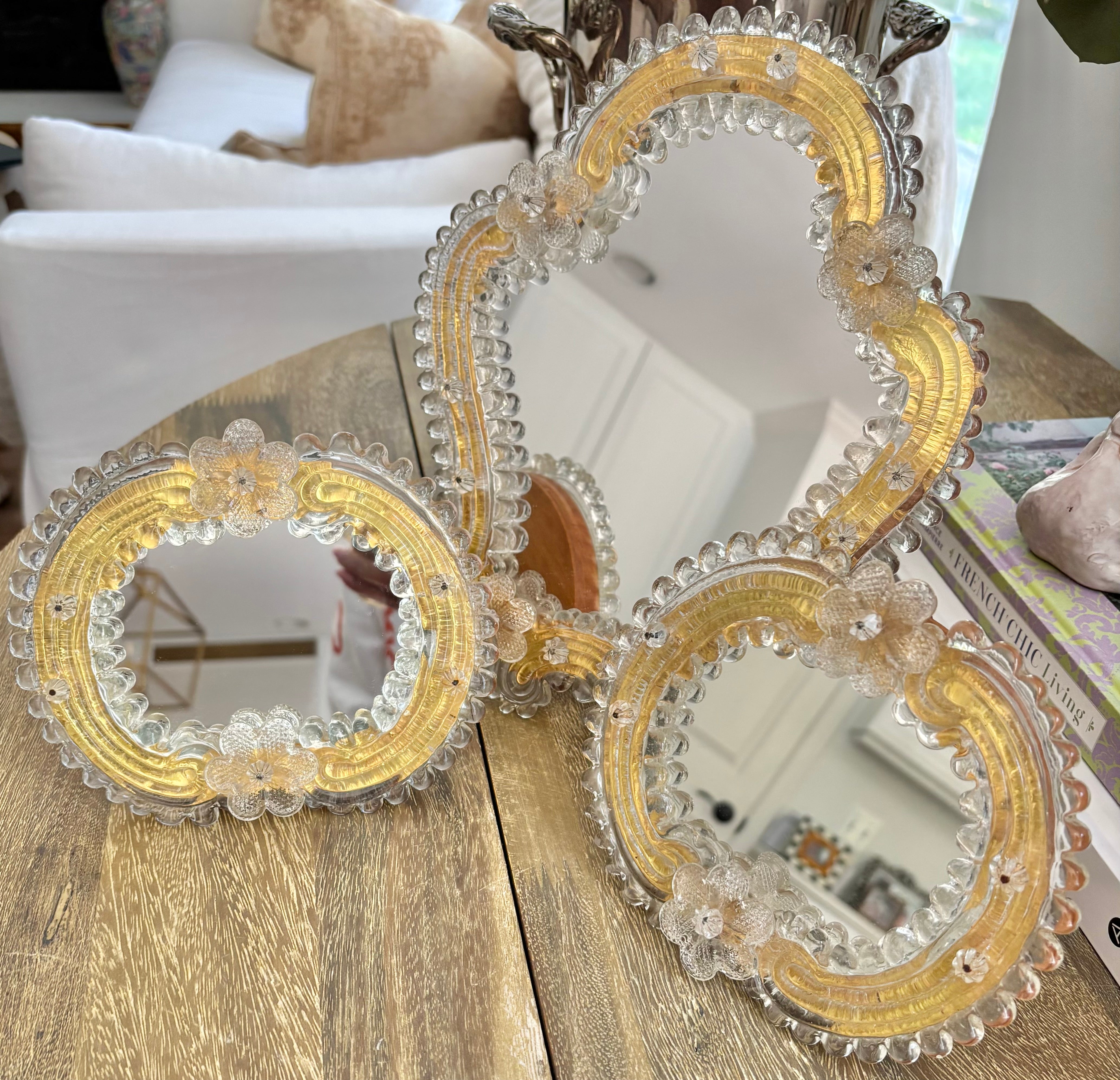 Pristine mini floral Murano mirrors. Wooden back with kickstand to style on a vanity, table or shelf. Features triangle piece... Read more