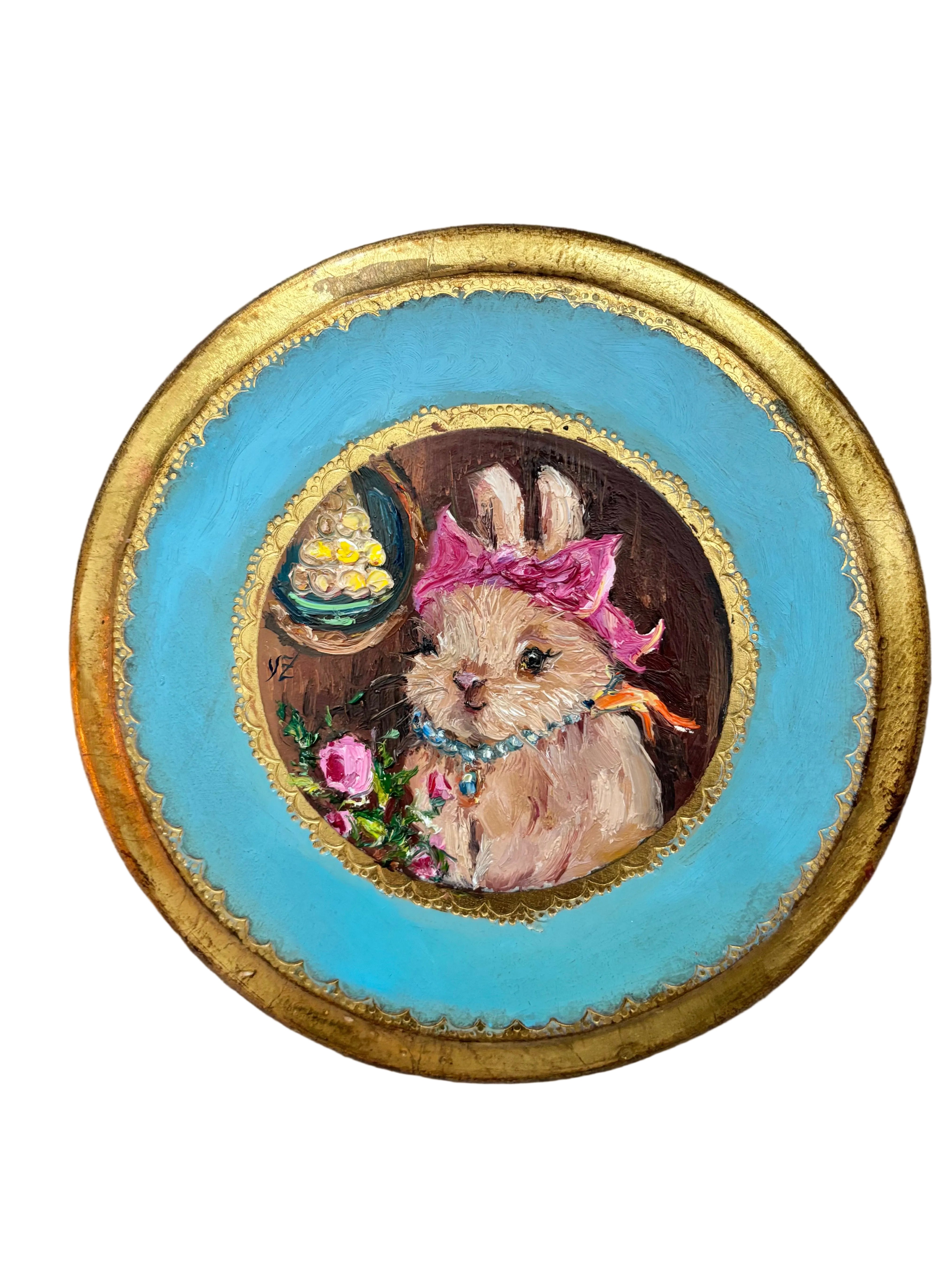A whimsical portrait infused with warmth and humor, this painting features a charming Parisian bunny adorned with florals. Rendered in romantic Impressionist style, the piece celebrates innocence, playfulness, and quiet joy. Set on a gilded Florentine plaque, it offers a delightful balance of refinement and lighthearted storytelling—perfect for collectors drawn to poetic, character-driven works.