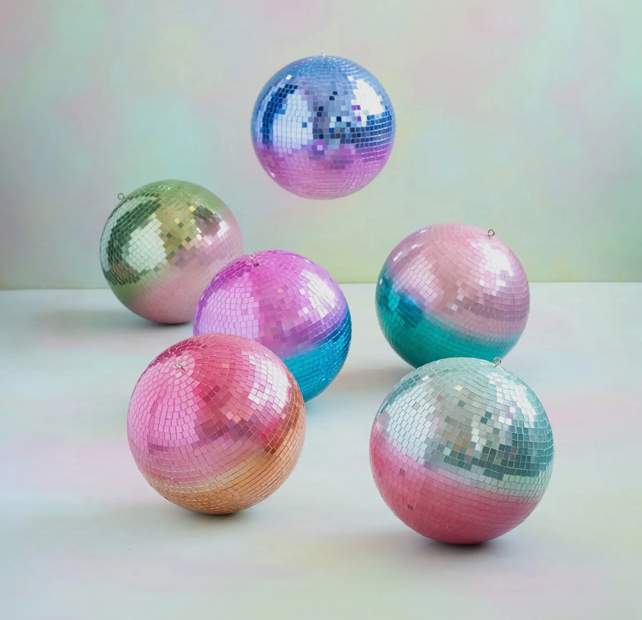 Decadent 12" Disco Ball. Spin into a swirl of sparkle with the Decadent Disco Balls—where retro glam meets candy-colored charm! These oversized glass showstoppers shimmer in a sugary spectrum of hues, transforming any space into a celebratory dreamscape. Whether hung high at a holiday fête, twinkling in a twirling window, or lounging luxuriously in a party nook, these balls are bursting with joyful light and unapologetic flair. With six fabulous color combinations to choose from, each one is a glitzy globe of glee, dancing in the light like a sugarplum on stage.