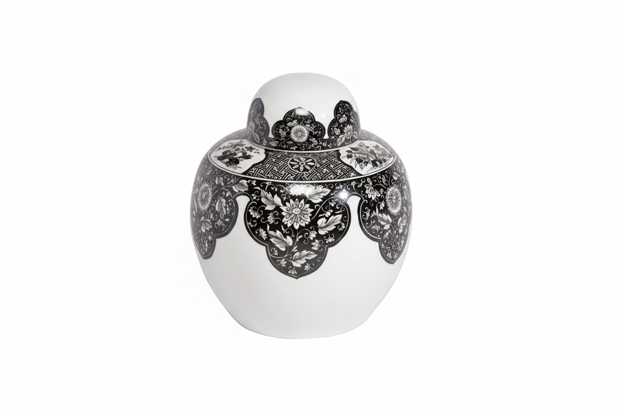 This Ethan Allen ginger jar pairs crisp black and white contrast with ornate floral medallions for a look that feels both timeless and statement-making. The rounded silhouette keeps it soft and elegant, while the graphic detailing gives it that Palm Beach polish we love.