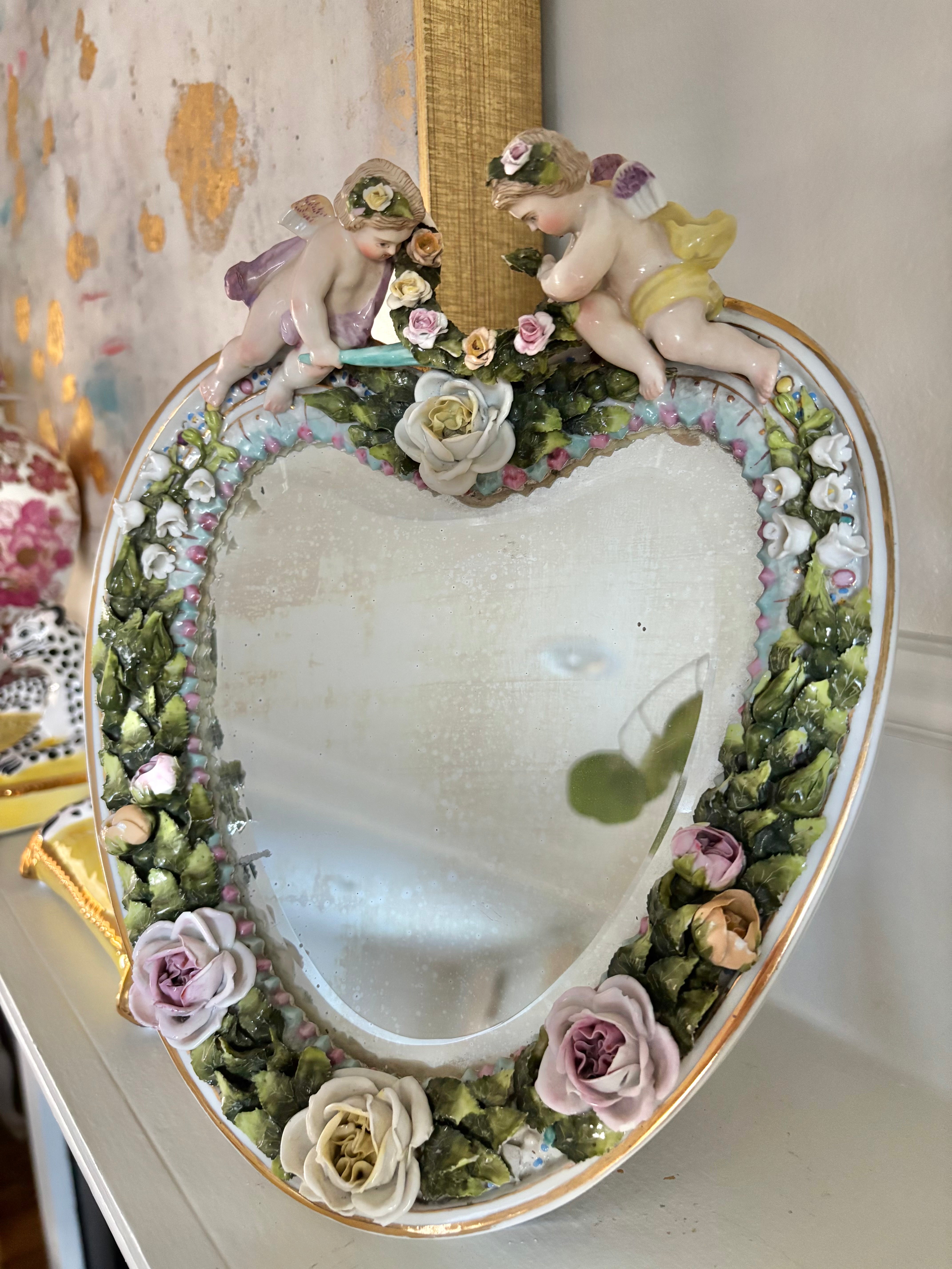 German paint decorated porcelain mirror, late 19th century, in the manner of Meissen or Dresden, the crest with winged cherubs... Read more