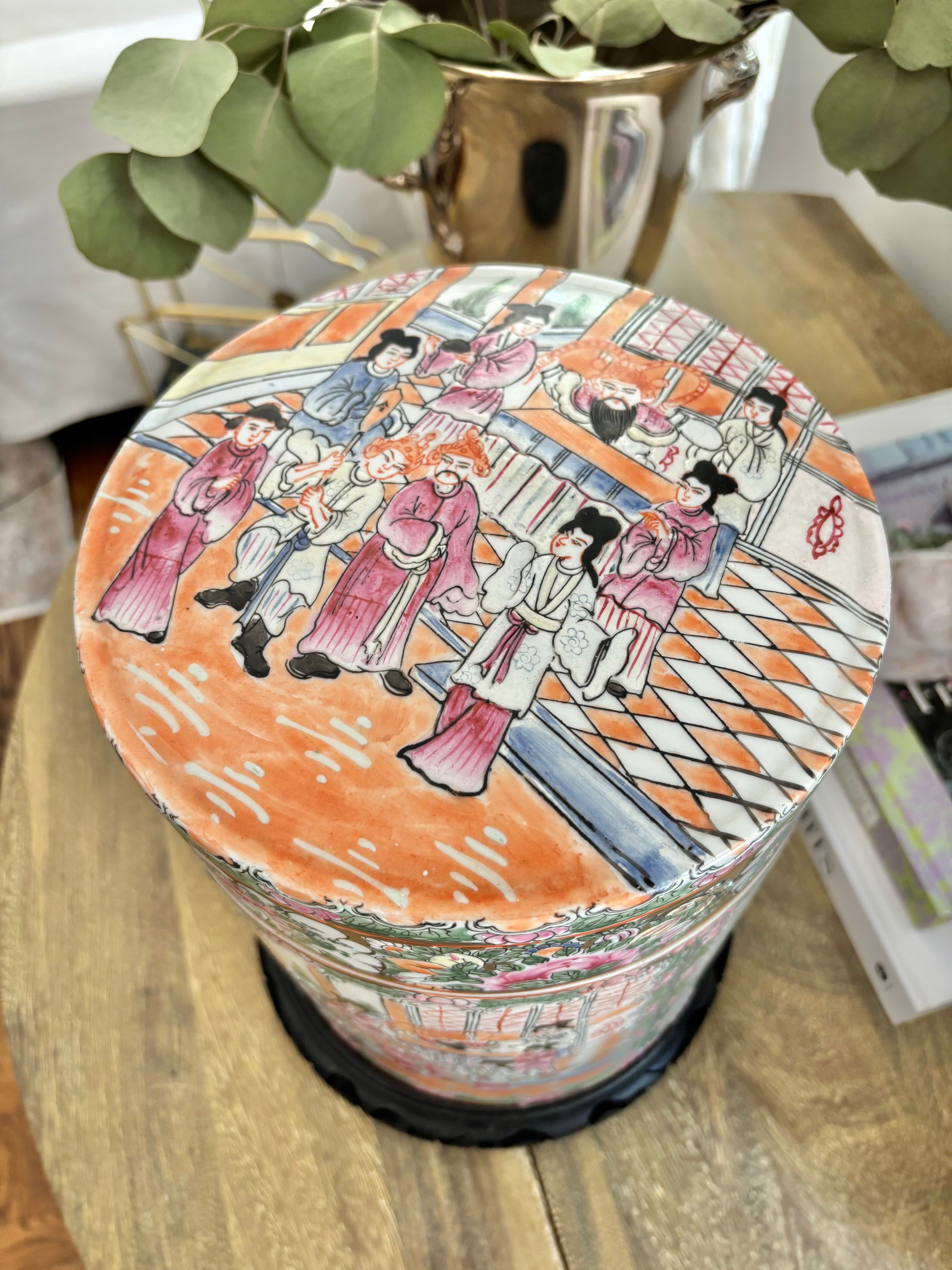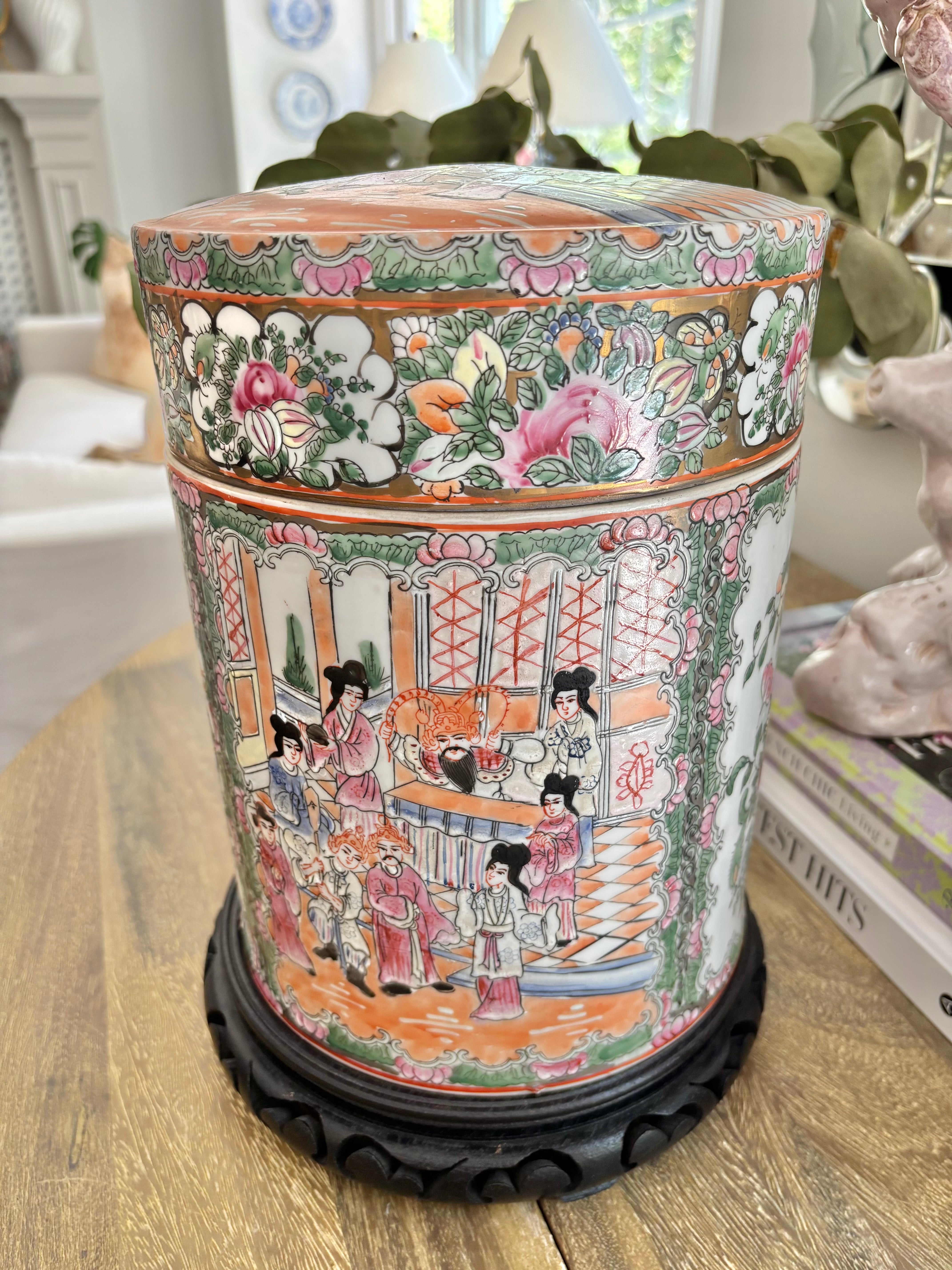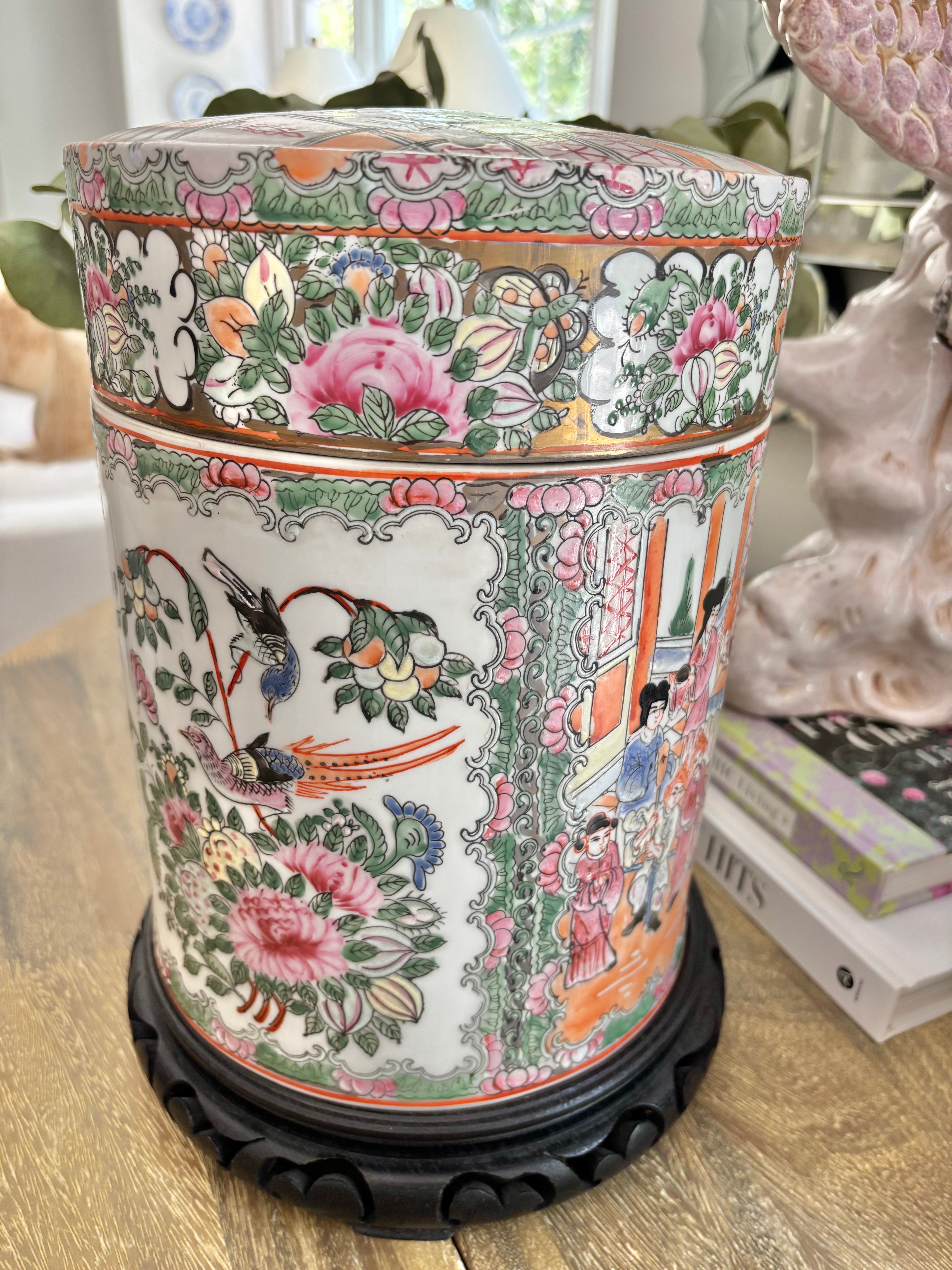Beautiful Rose Famille Tea Caddy 12” Tall with included stand. Read more