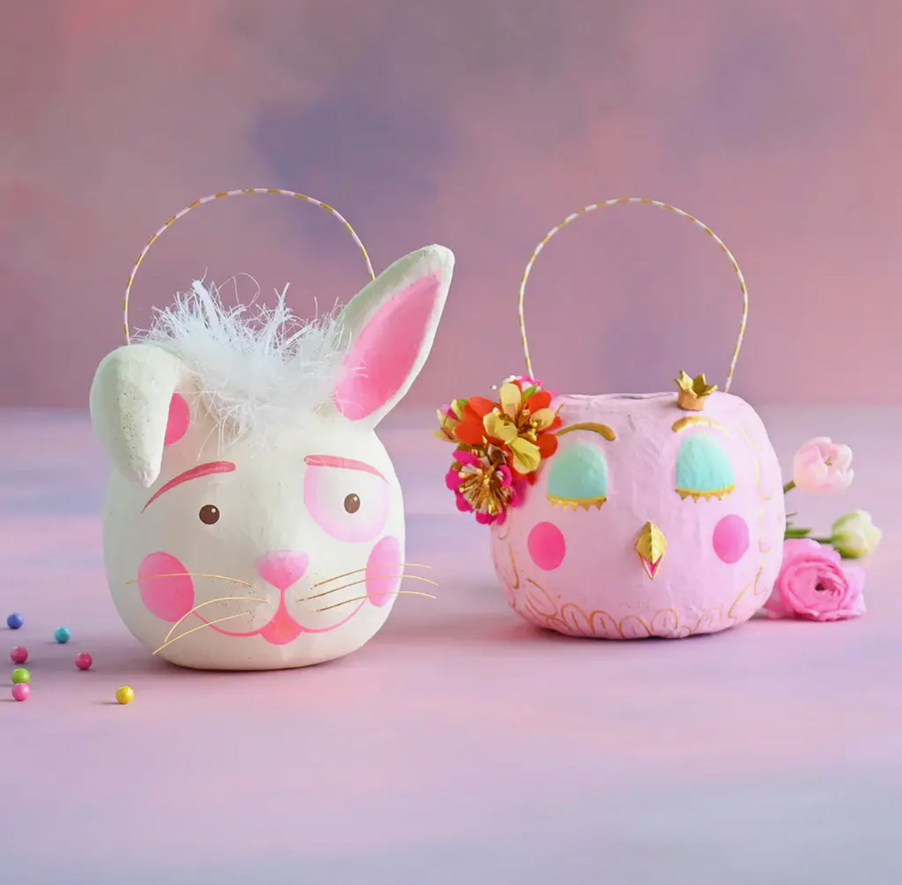 Glitterville's Pinky Cotton Tail Bunny & Princess Peep Chick Bucket 12" Papermache & trims Hand-painted & gold leafed Read more