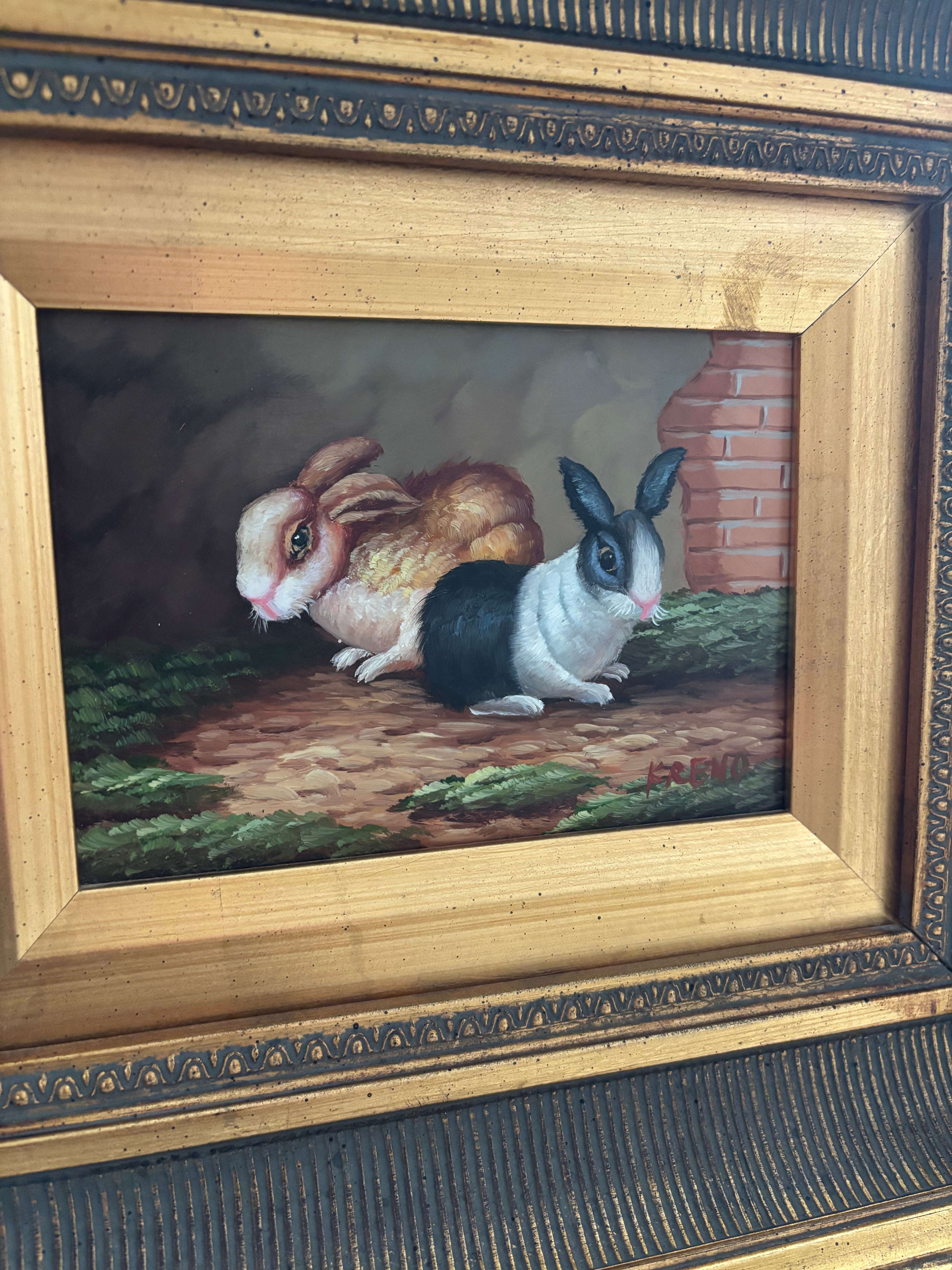 An utterly charming original oil on board featuring two beautifully rendered rabbits nestled beside a warm brick wall. The detailing is rich and expressive — from the soft layering of their fur to those delicate pink noses that instantly draw the eye.