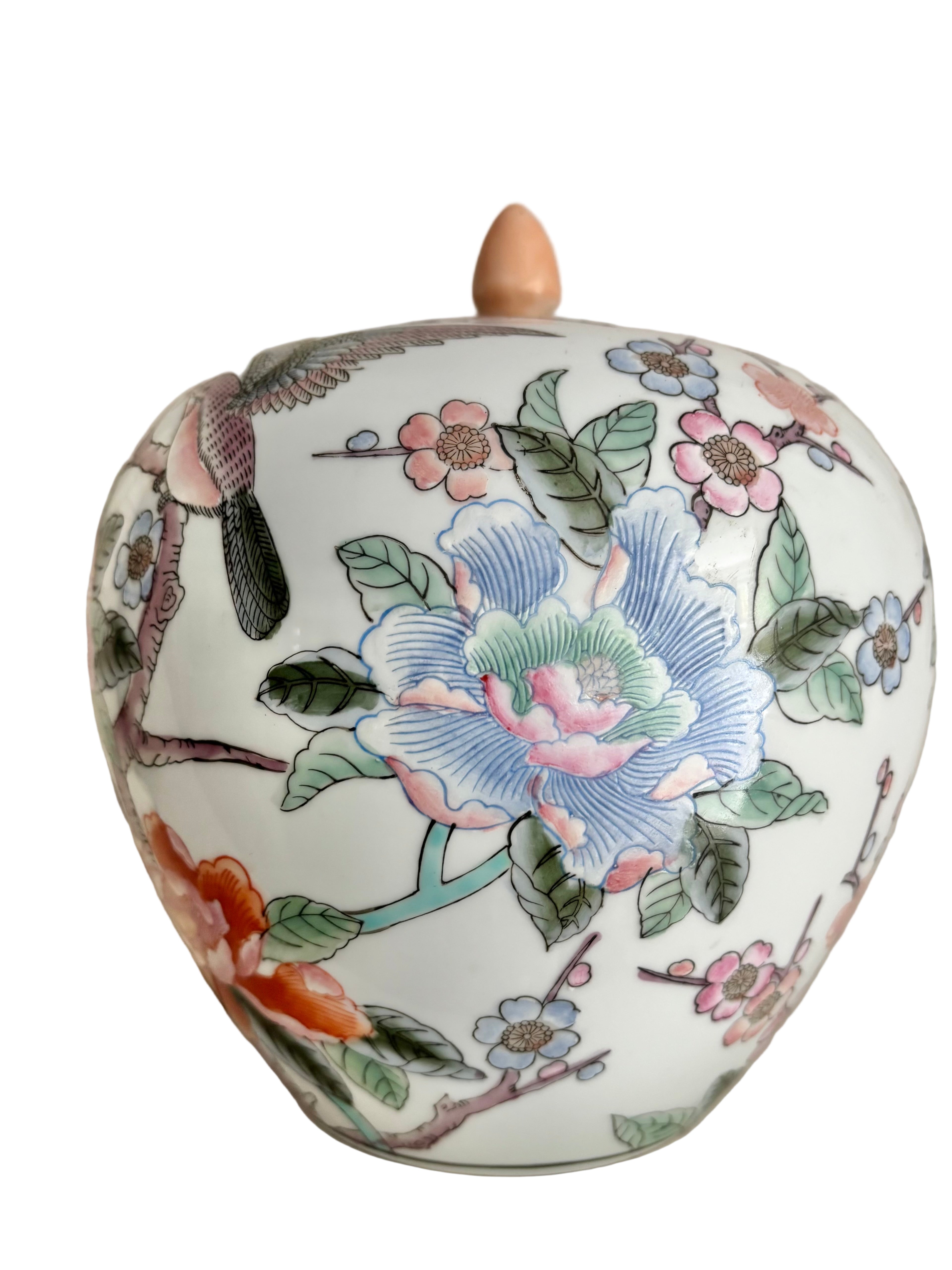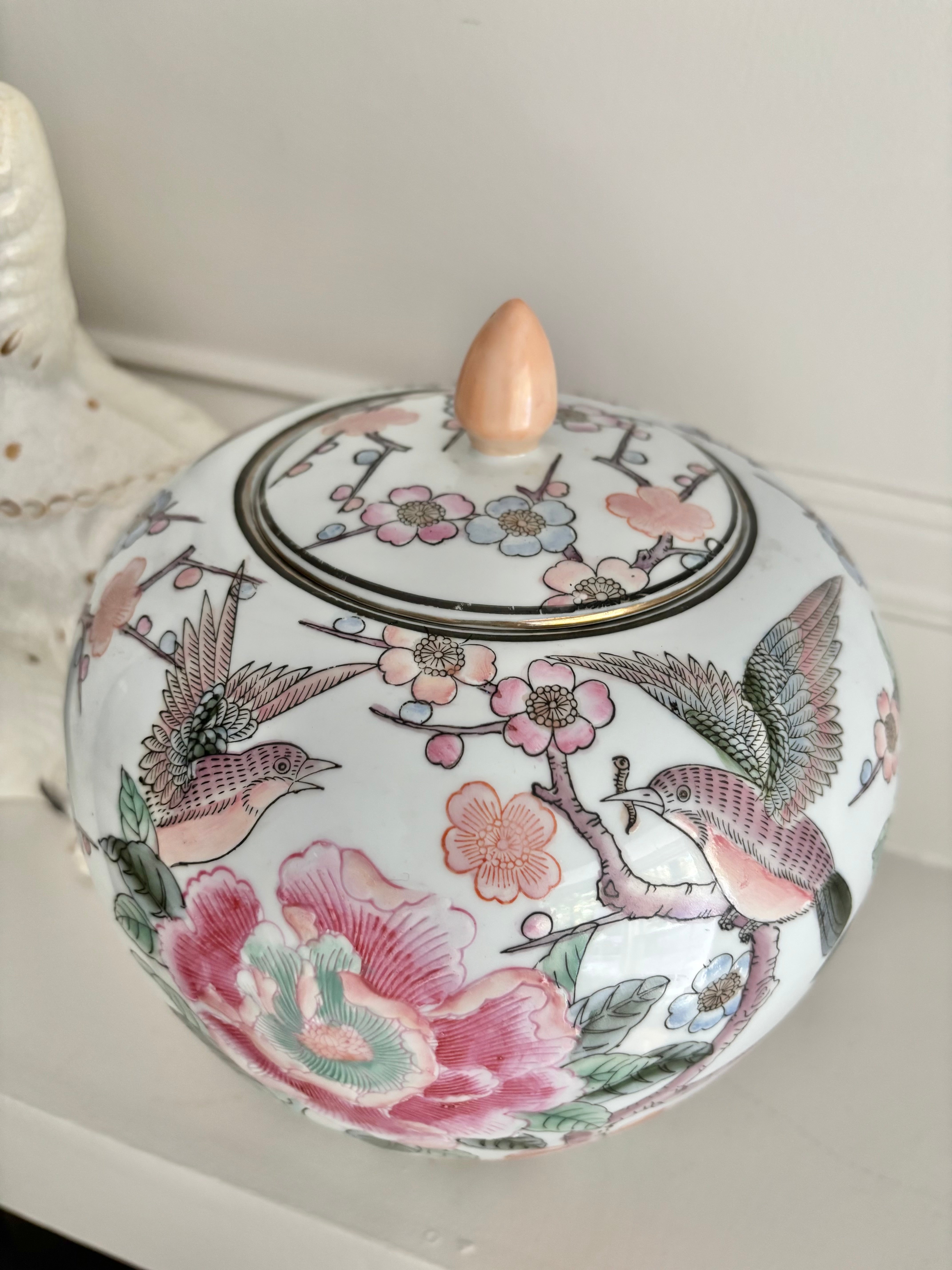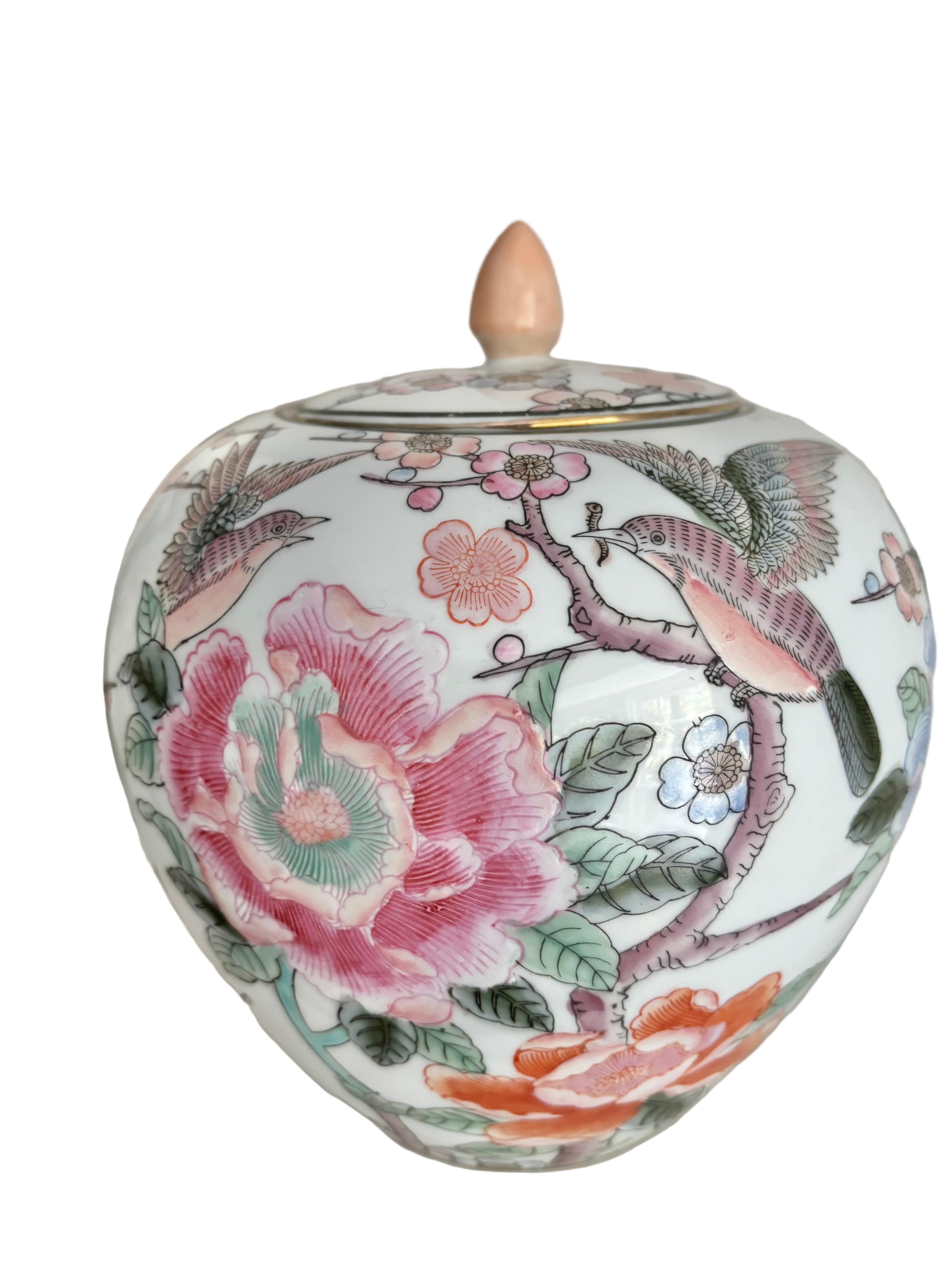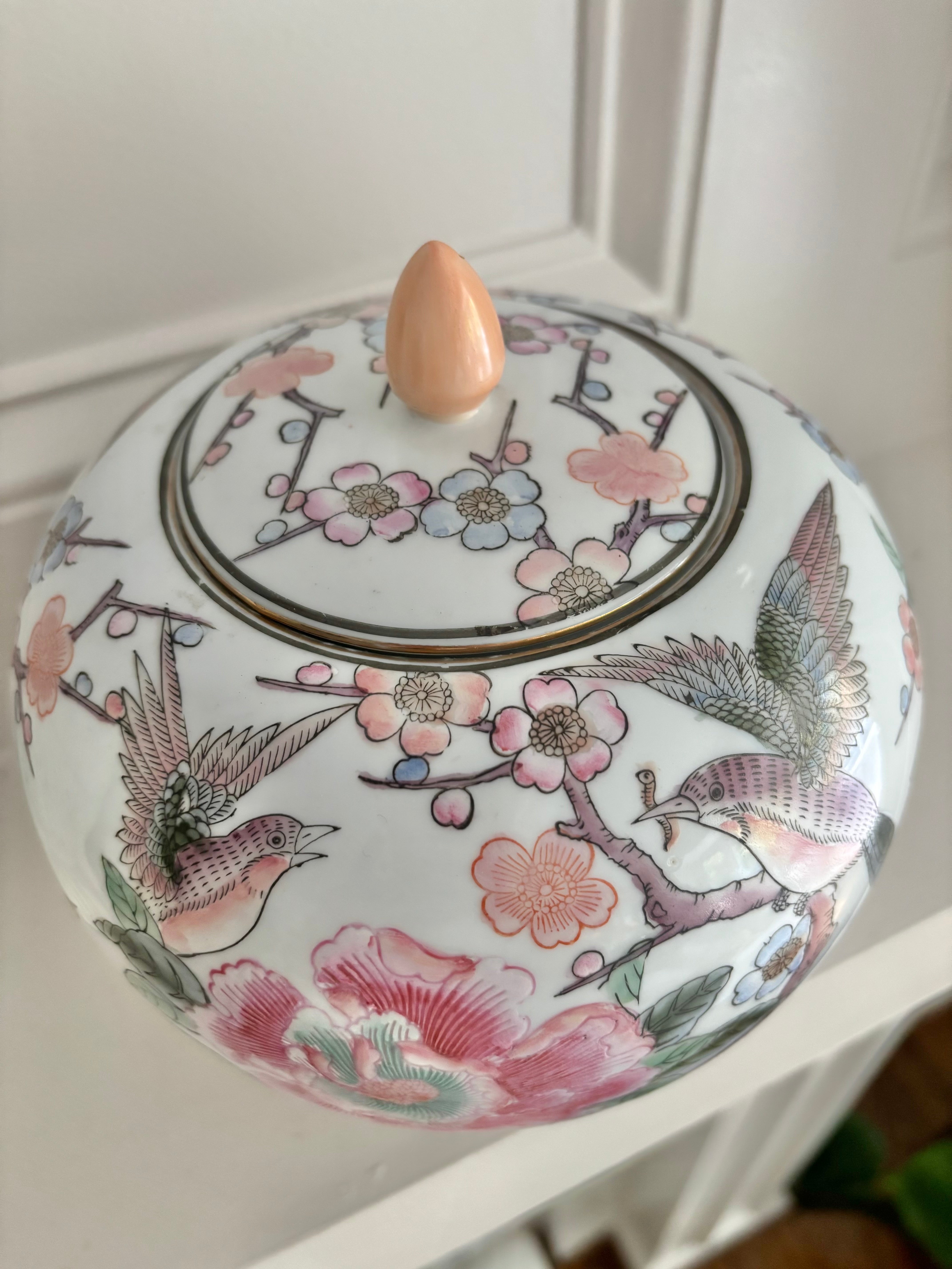 Beautiful vintage ginger jar made for Neiman Marcus featuring pink birds, peonies and cherry blossoms. In excellent vintage condition. Read more